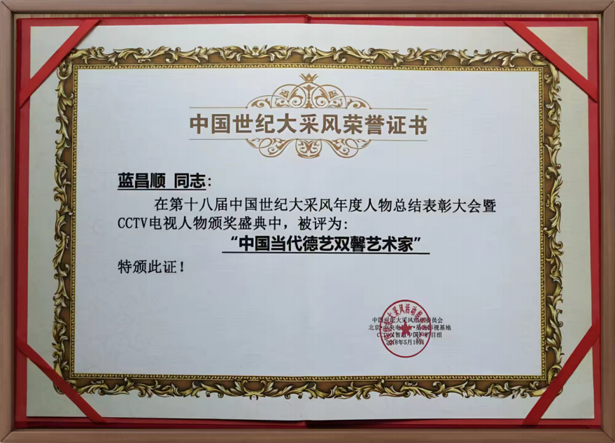 2018年5月18日在第十八届中华世纪大采风年度总结表彰大会暨CCTV电视人物颁奖盛典荣获“中国当代德艺双馨艺术家”;