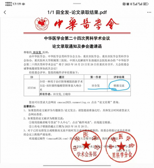 2025年10月23日至26日,中华医学会第二十四次男科学术会议在重庆召开,山西省汾阳医院生殖医学科主治医师田全发医生携其《介绍一种治疗附睾梗阻的新术式-双针圆性输精管附睾套叠吻合术》成果参会,在会场展示其论文内容,与国内男科领域同仁交流探讨。