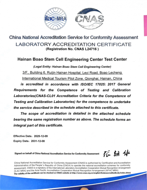 近日,海南省干细胞工程中心质检中心成功通过中国合格评定国家认可委员会(英文缩写为CNAS)认可并获得CNAS权威认可证书,这标志着工程中心细胞制剂放行检验体系的相关检测项目已经符合CNAS认可标准,工程中心实验室在人员专业素养、设备精度保障、检测流程管控、数据可靠性等环节的管理水平与技术能力已达到国际认可水准。