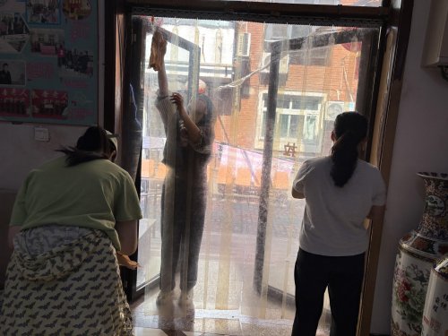 在工作人员的帮助下,队员们帮忙擦玻璃、擦门帘。