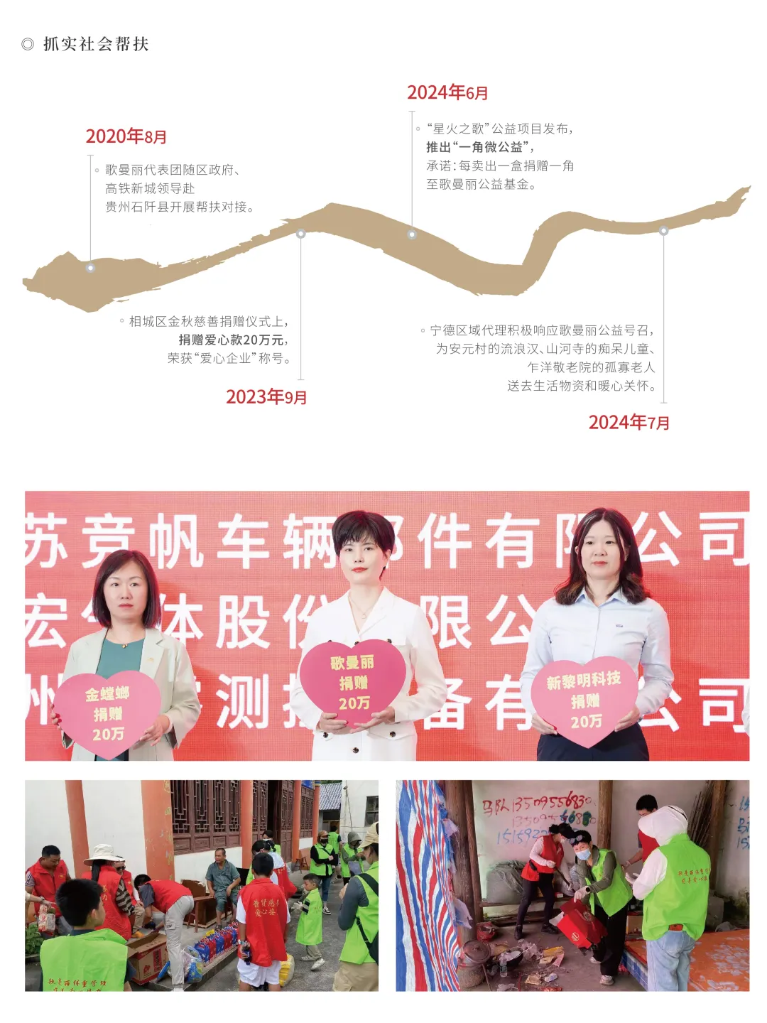 从捐赠助学、关爱妇女儿童到援助抗疫、致敬城市守护者,歌曼丽的公益遍布了教育、健康、应急救灾等多个领域。尤其是【翻山而歌儿童公益助学基金】、【星火之歌公益项目】等的持续落地,仅仅这几年,歌曼丽在公益上的投入就超过了300万元,帮助了无数儿童、妇女、老人和一线工作者。