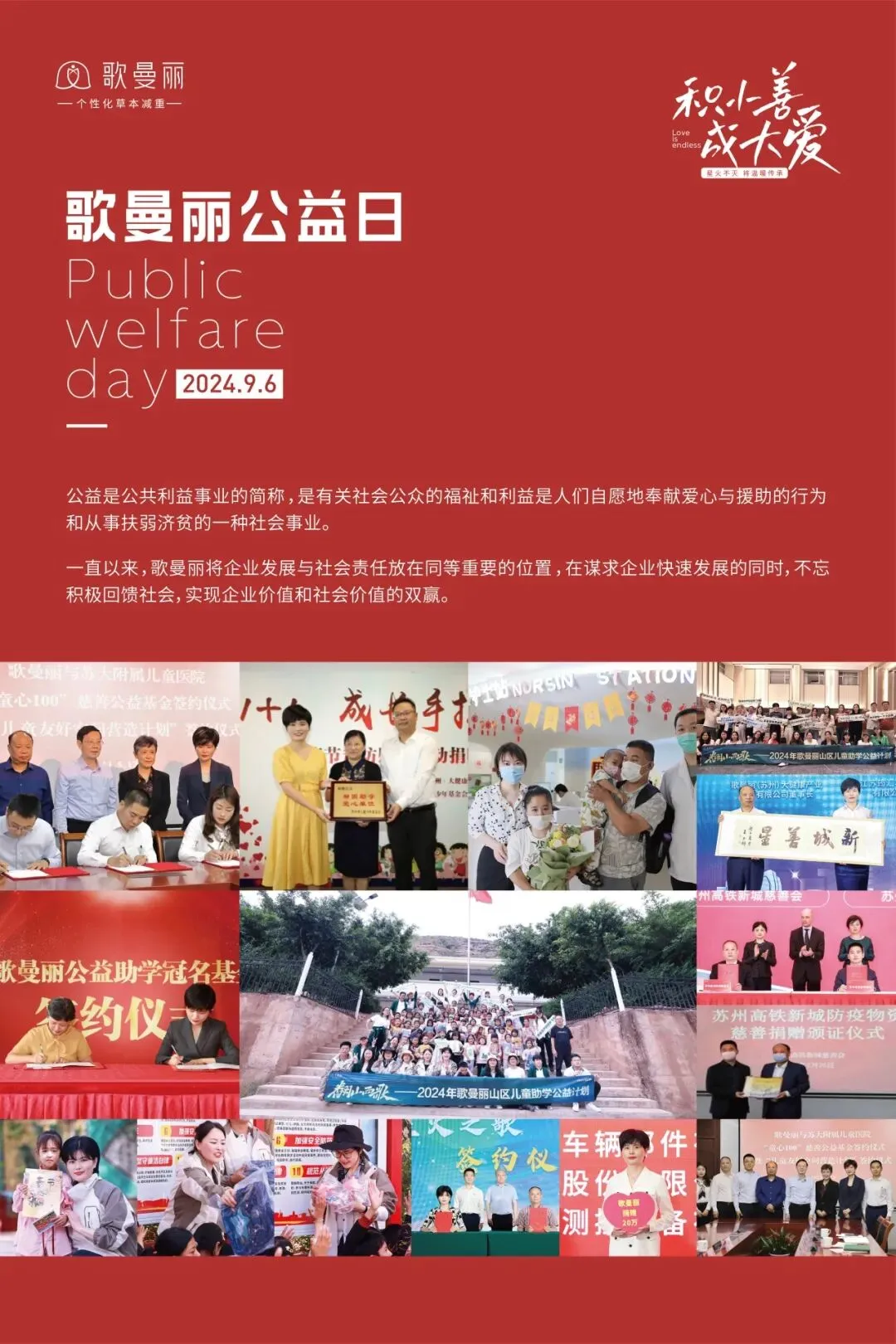去年歌曼丽将9.6作为歌曼丽公益日,积小善成大爱,呼吁更多的歌曼丽家人及爱心人士加入到公益事业的大家庭中。为“一角微公益”计划传承公益星火,承诺每卖出一盒产品就捐赠一角至公益基金,点亮人人公益心。