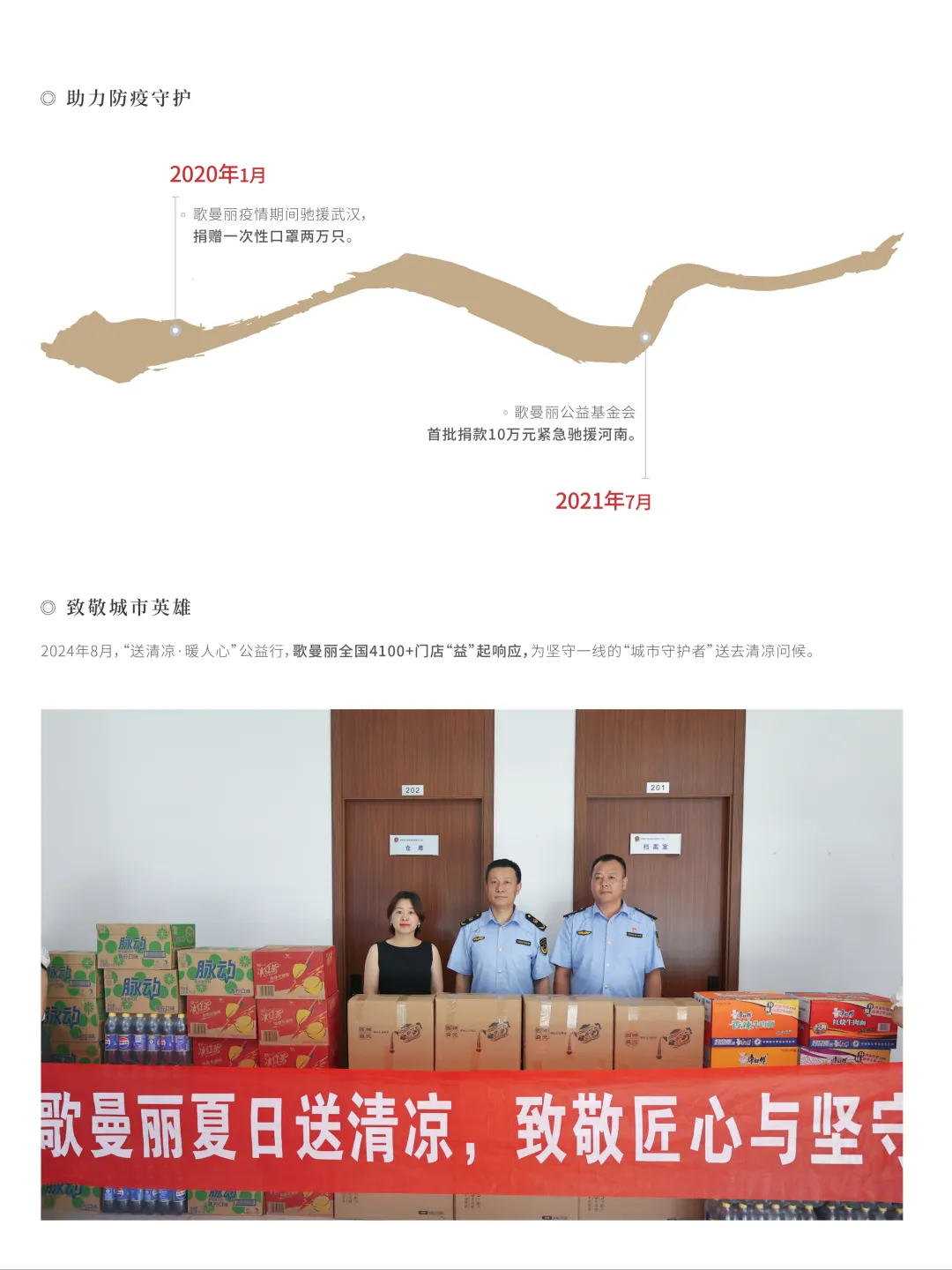 歌曼丽自成立以来,始终坚守公益之道,让其融入企业发展的血脉,在谋求企业发展的同时,不忘积极回馈社会,实现企业价值和社会价值的双赢。