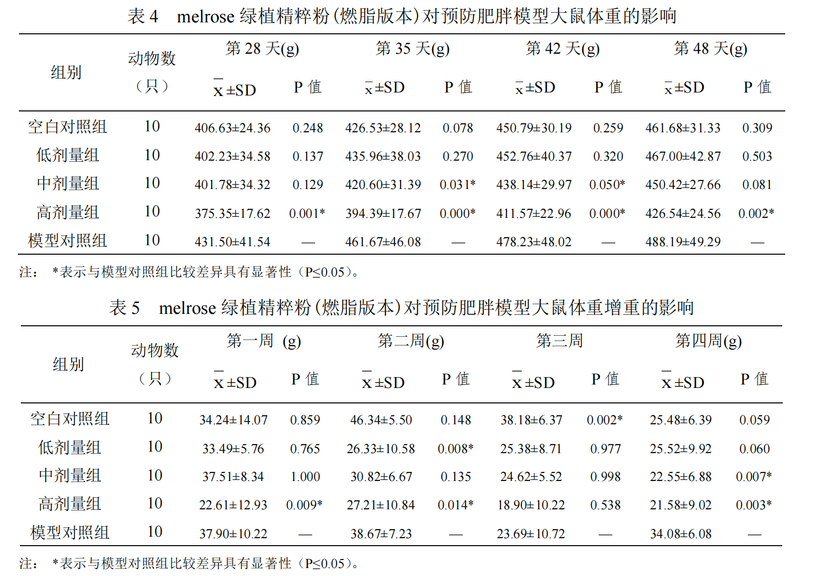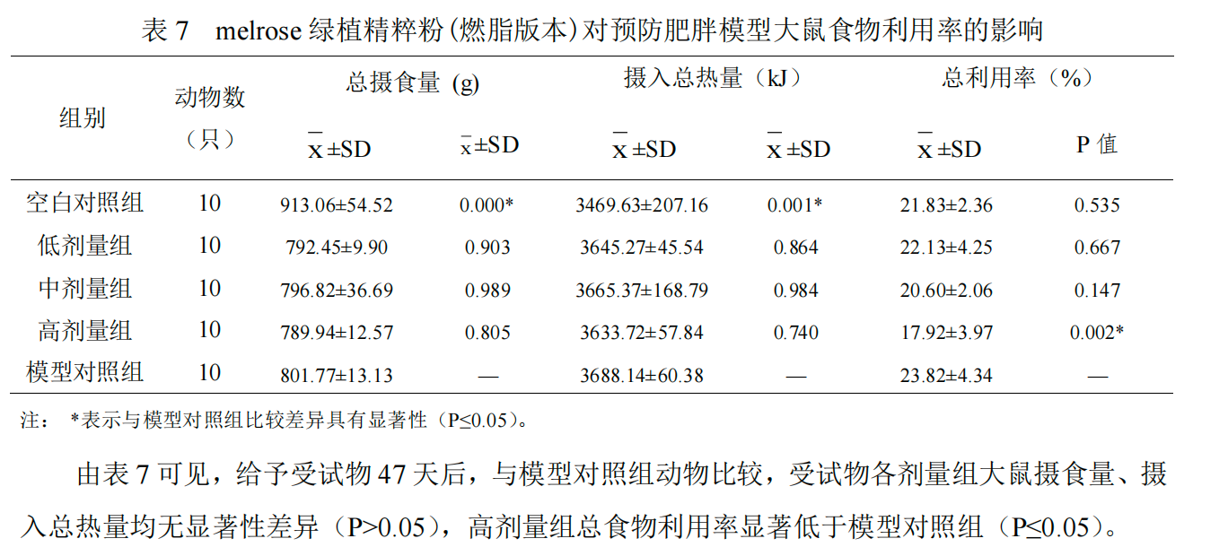 实验核心数据给出了明确答案,接受Melrose绿植精粹粉(燃脂版)干预的大鼠,其摄食量与总热量摄入均与肥胖模型对照组无显著差异,这意味着无需刻意节食、不改变饮食量,就能实现有效的体重与体脂管控。
