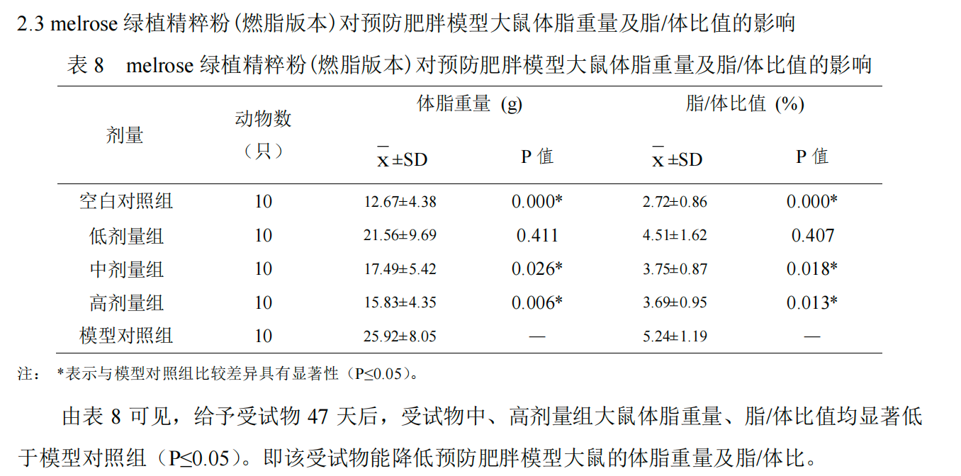 减肥的核心在于减内脂。实验终点对大鼠睾丸及肾周围脂肪垫(衡量内脏脂肪的关键指标)进行了称重。结果显示,中、高剂量组的体脂重量和脂/体比均显著低于模型对照组。这意味着,Melrose绿植精粹粉似乎“教会”了身体减少脂肪储存,而不是堆积在腰腹内脏。